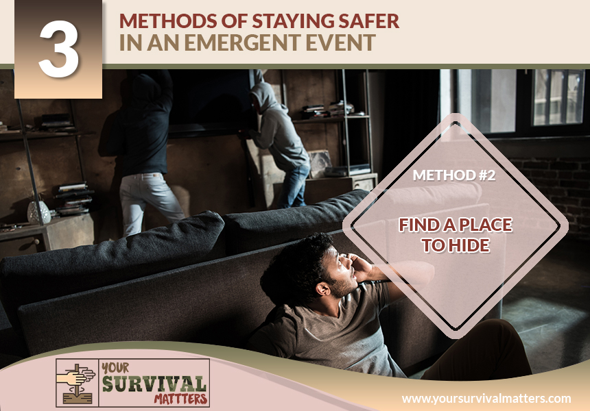 So if you don't feel that your chances of surviving an emergent event are in your favor, then hide (in closets, cabinets, or under beds if need be) and remain hidden until the threat has passed. Try to find the furthest places from entrances and valuables. Teach your family members to do the same.