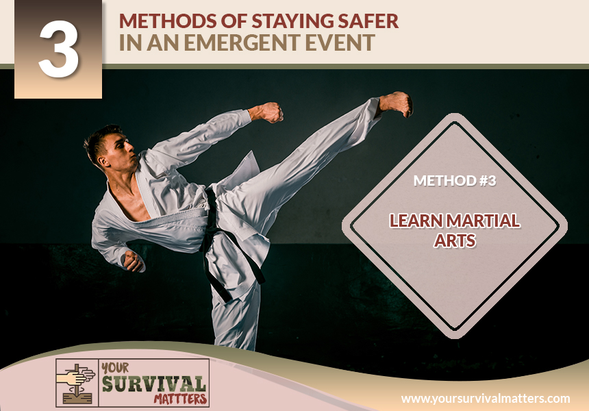 The reason that it's wise to know martial arts is because it gives you an edge in the event that you can't get to your weapon or you're outnumbered. Martial arts enables you to even the playing field when you're up against more than one opponent, and getting a weapon or hiding isn't an option. You can learn the skills of martial arts by taking classes that teach karate, kickboxing, Jiu-Jitsu, Tae Kwon Do, and more.