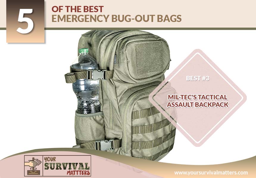 When you're looking for an excellent bug-out bag, you want to get something like what the military uses. Those bags, like the Mil-Tec Military Army Patrol Molle Assault Pack Tactical Combat Rucksack Backpack Bag, are designed to be tough. The bag is water-resistant to help it stay dry in inclement weather. In addition, it has two big compartments that offer a variety of smaller spaces you can zip and store things.