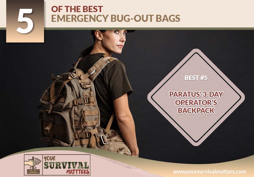 Another great bag is the Paratus' 3-Day Operator's Pack Military Style MOLLE Compatible Tactical Backpack Bug-Out Bag. This bag is completely customizable. It has the MOLLE system and other attachment features.